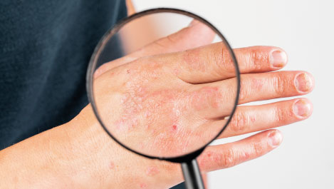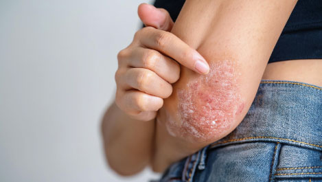 Doença inflamatória crônica que provoca placas avermelhadas, descamação e alterações na textura da pele.